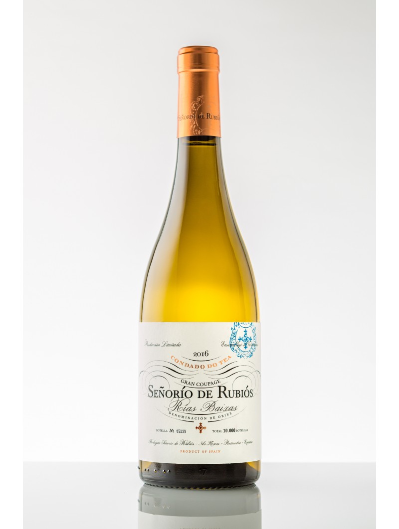Este viño representa a elaboración típica da subzona de O Condado do Tea. Tradicionalmente, os viticultores cultivaban as diversas variedades brancas nas mesmas parcelas e, trala vendima, as fermentaban xuntas nos mesmos depósitos. No noso caso, fermentamos os mostos das diferentes variedades e logo ensamblamos os viños resultantes. O Señorío de Rubiós Condado branco xorde tralo procesado das mellores uvas albariño, treixadura, loureira blanca, godello e torrontés.